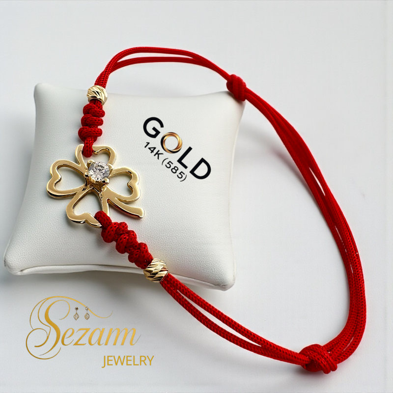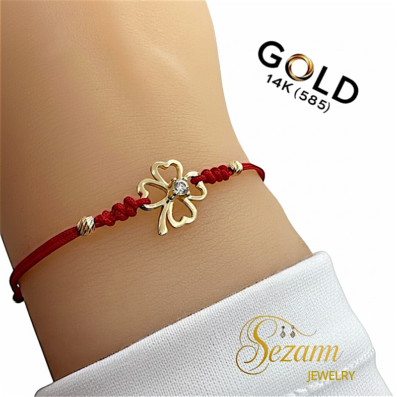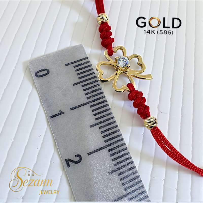 Гривна с червен конец и златна детелина 10 мм с цирконии 14К (585)
