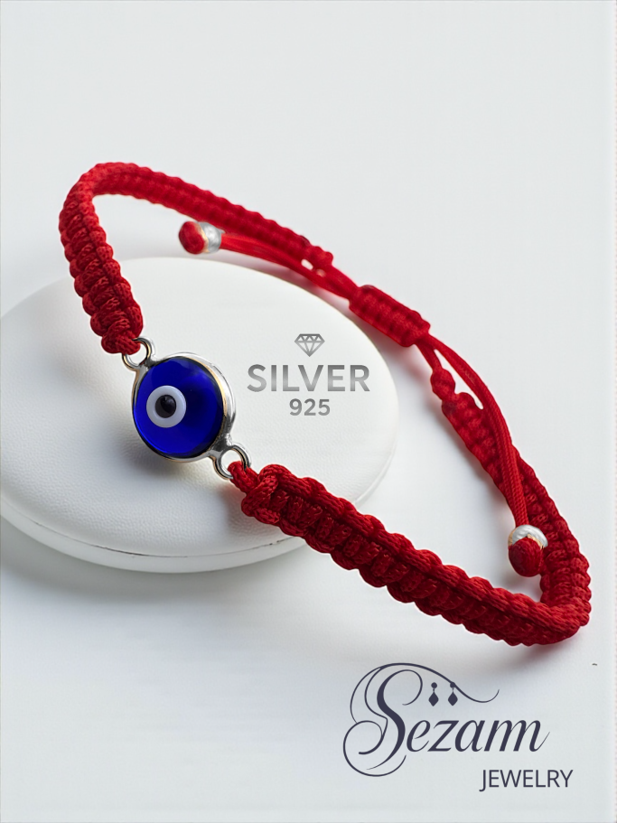 Сребърна гривна Червен Конец със Синьо Око – Регулируема, Ръчна Изработка