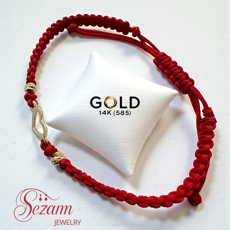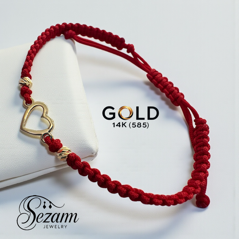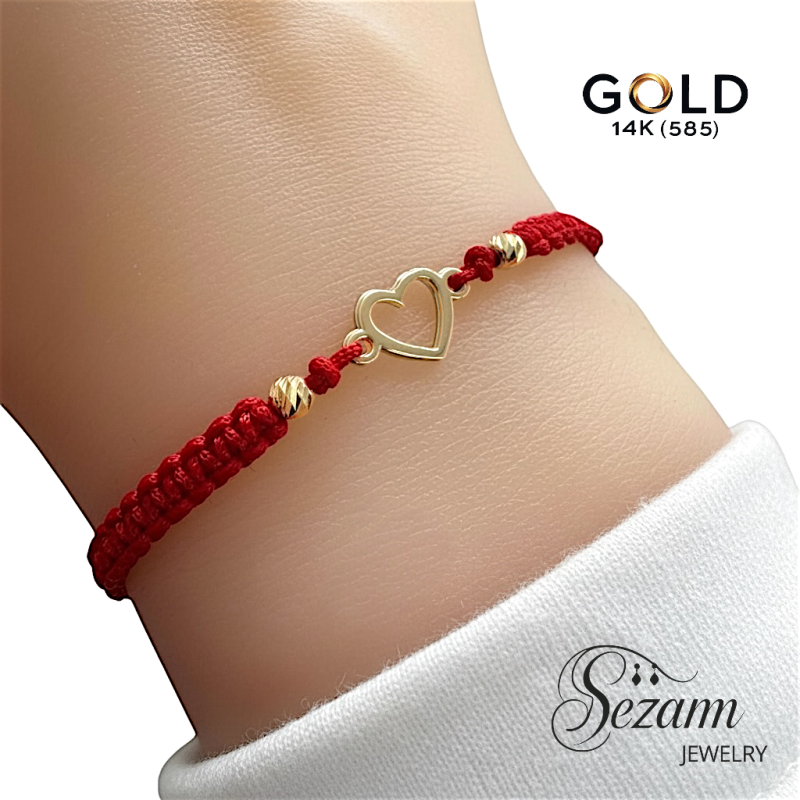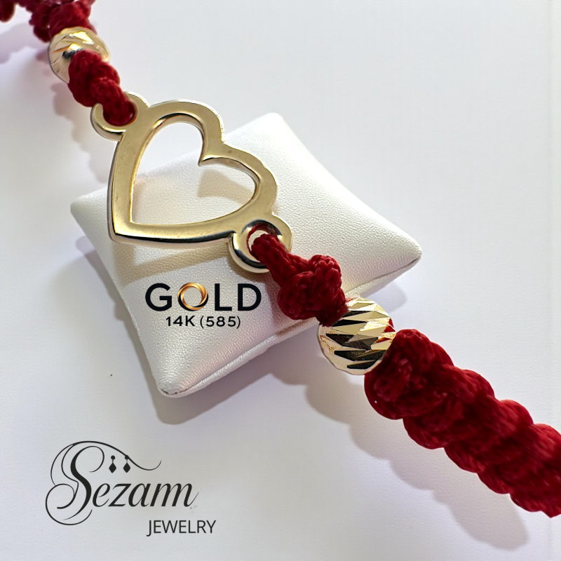 Златна гривна с червен конец и сърце 14K (585) – ръчна макраме, регулируем размер
