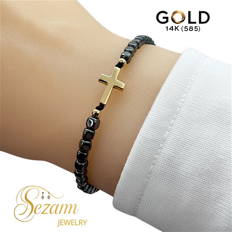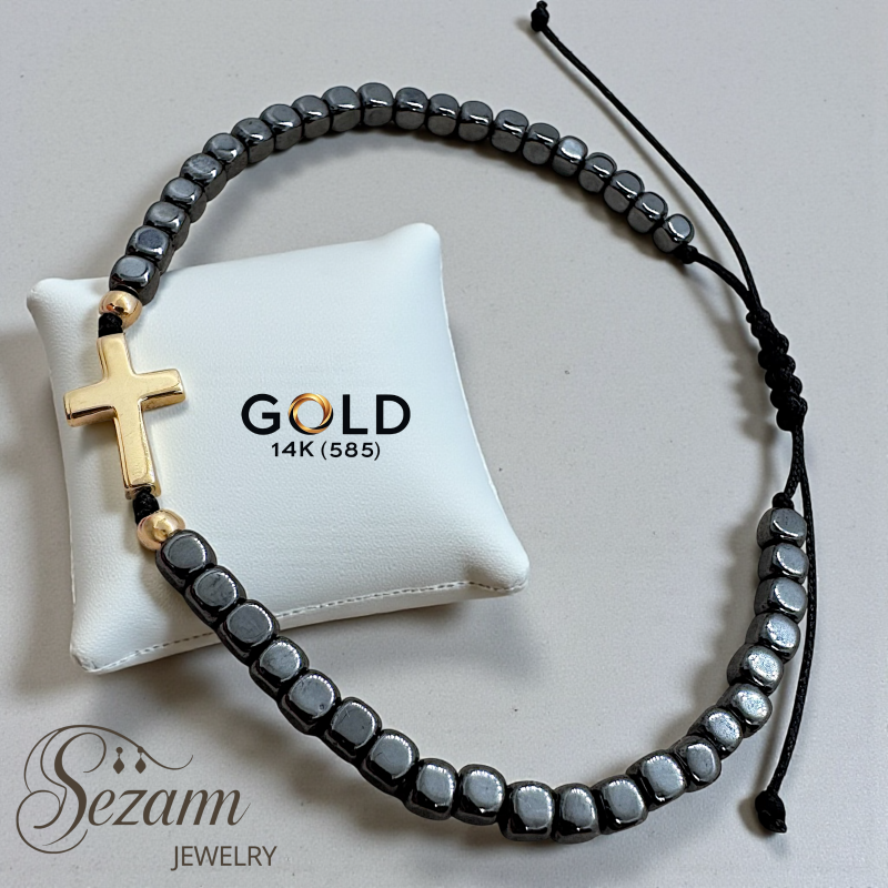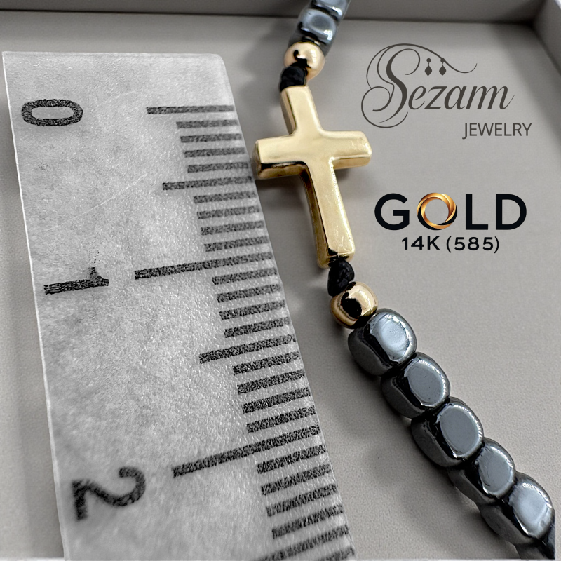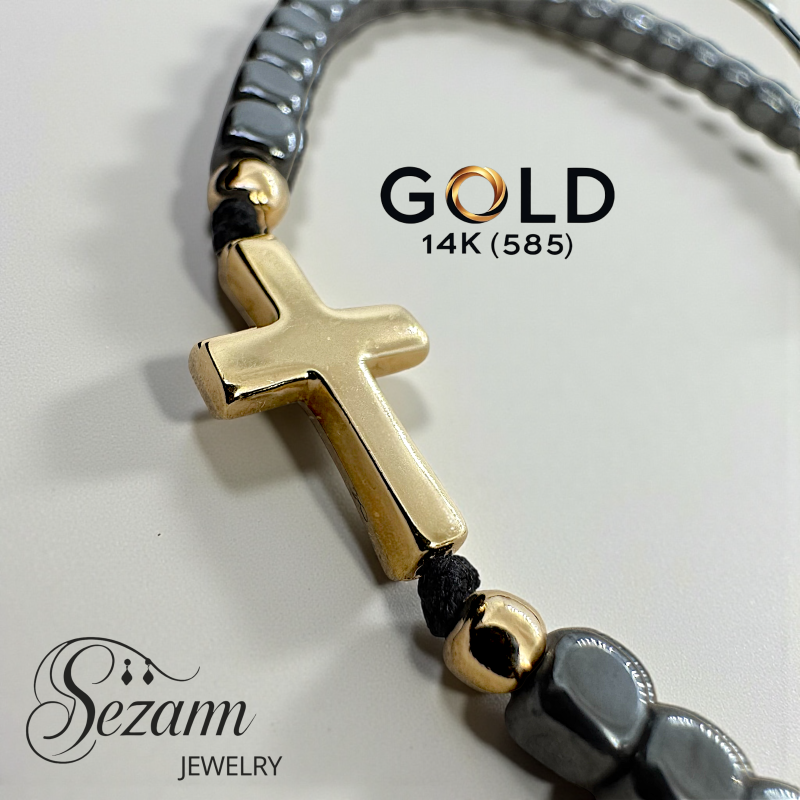 Златният кръст от 14 карата (585) е един от най-търсените символи в златни бижута с кръст, носещ значение на вяра, закрила и духовна защита. Комбинацията от гривна хематит и златен кръст 14К е предпочитан избор при мъжки, дамски и детски гривни, подходяща за подарък с религиозна и символична стойност.