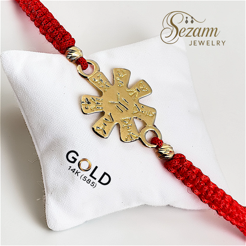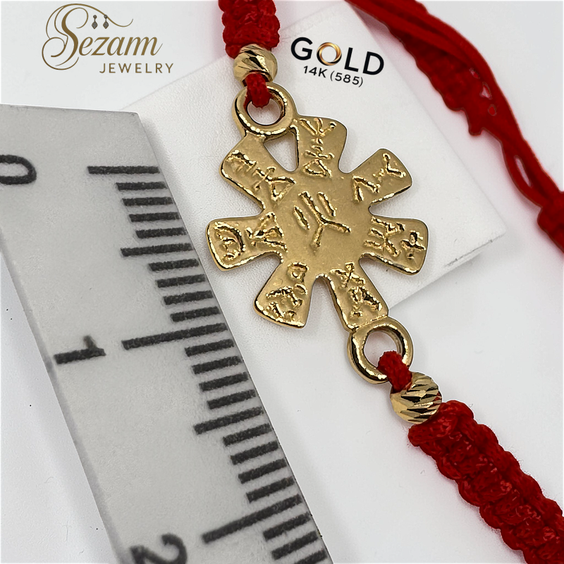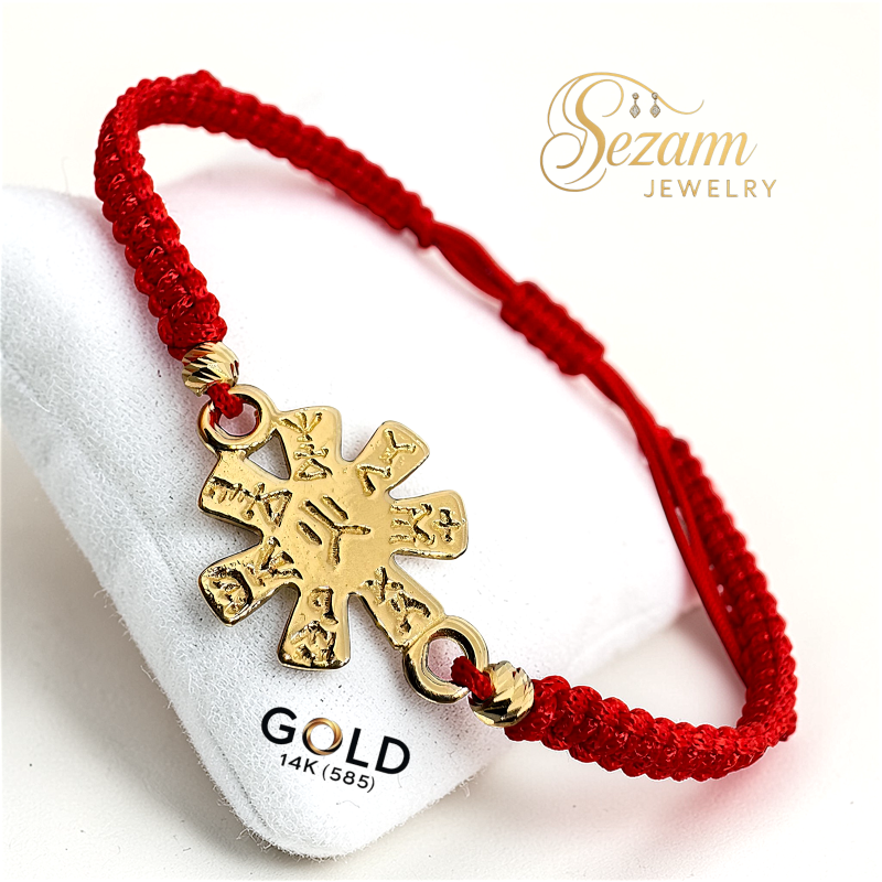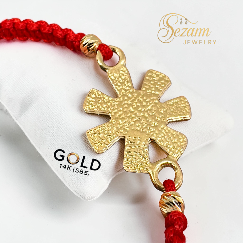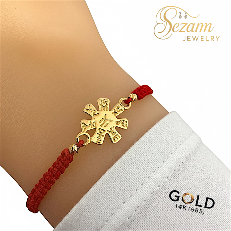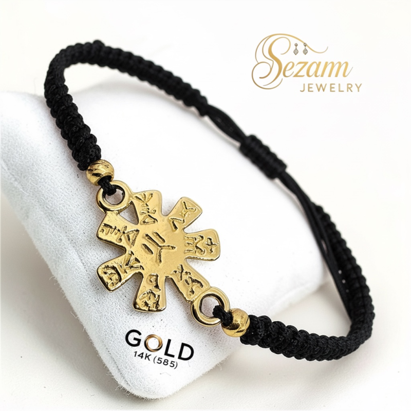 Гривна със златна Плиска розета, изработена от 14 карата злато (585) и ръчно изплетена макраме верижка. Бижуто съчетава български символ с минималистичен дизайн и удобно регулиране според размера на китката.