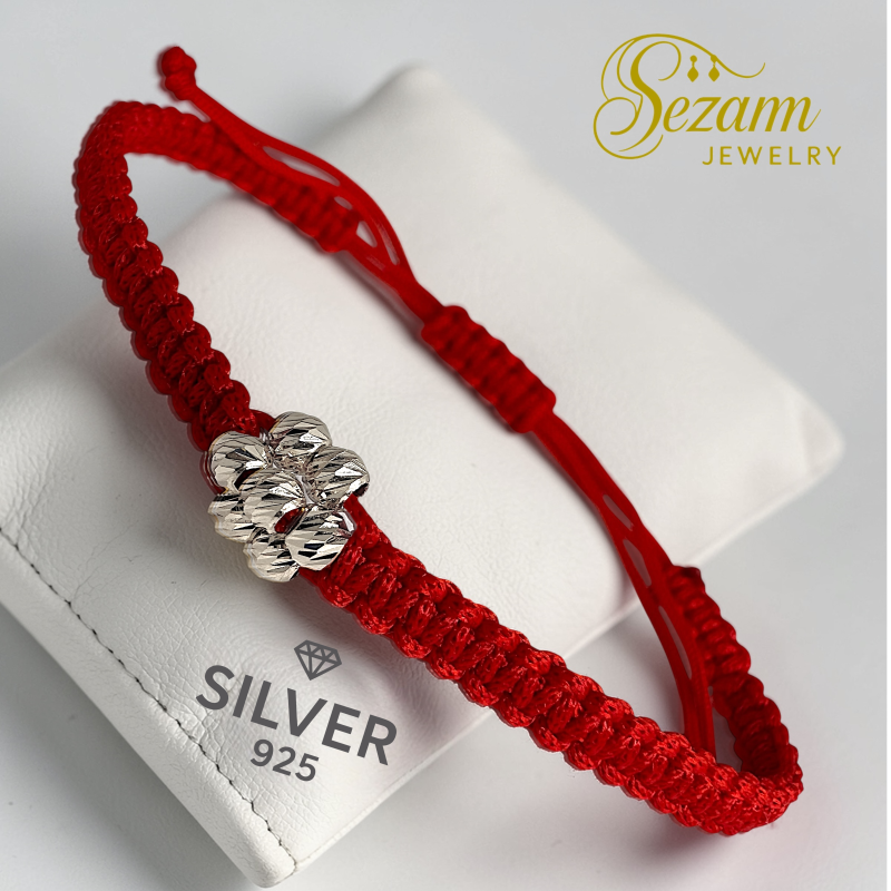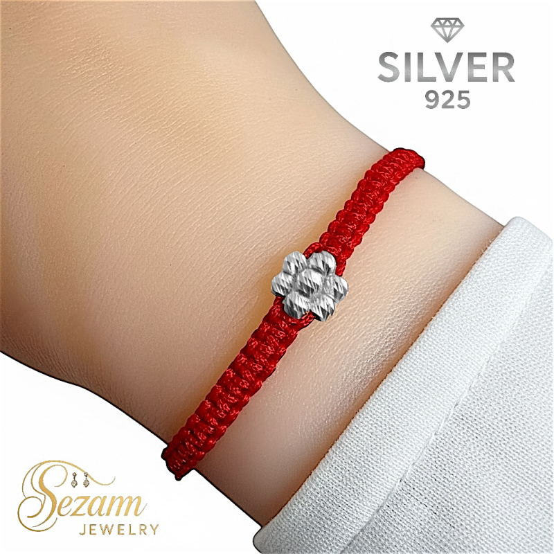 дамска червена макраме гривна със цвете от сребърни мъниста